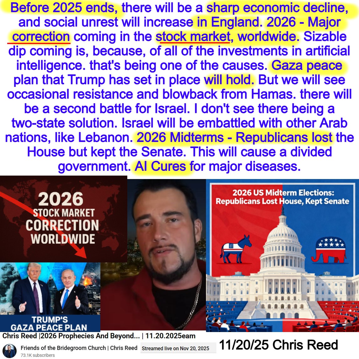 Sharp Economic Decline in England before 2025 ends. Major Worldwide stock market correction in 2026. Prophecy by Chris Reed on 11/20/25. See my summary, partial transcript, AI summary, and video link below:
