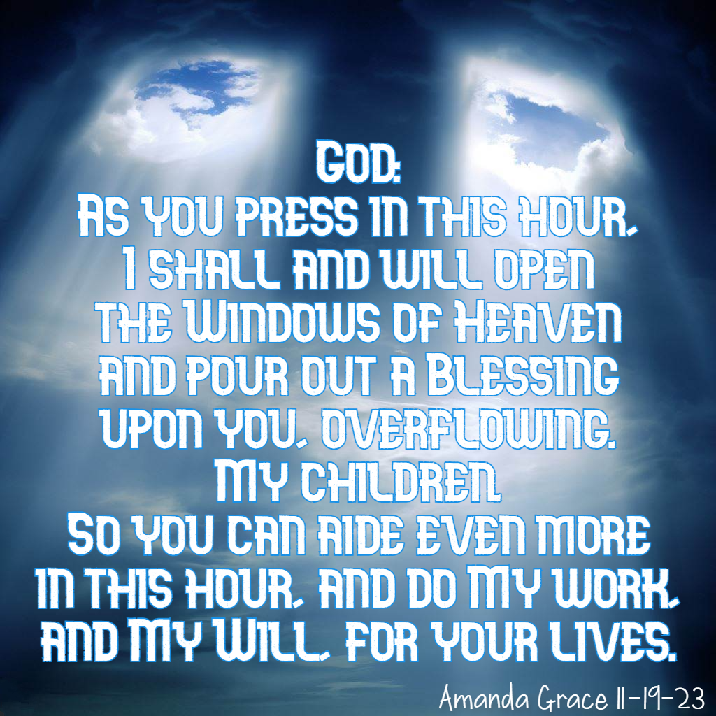 God: As you press in this hour, I shall and will open the Windows of Heaven and pour out a Blessing upon you, overflowing, My Children. So you can aide even more in this hour, and do My work, and My Will, for your lives. (Amanda Grace 11-19-23)