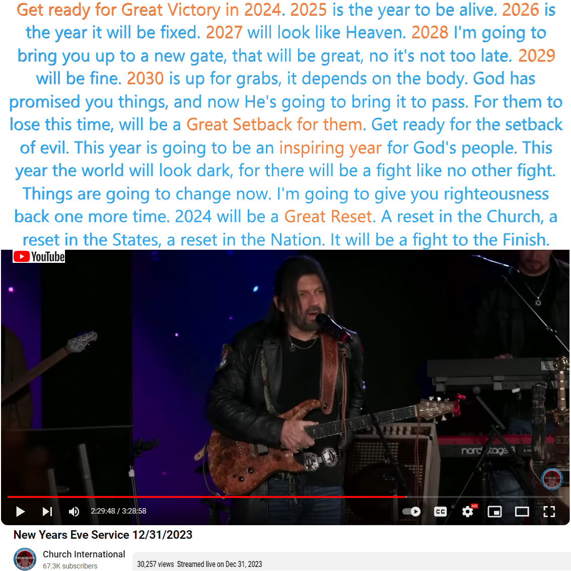 1:48:48 – (Bullock’s wife) – The Lord began to speak to me… He said that, 2024 will be a great reset. a reset in the church, a reset in the states, a reset in the nation. he said it will be a fight to the Finish. 2024, hold fast to the word of the Living God. do not Embrace an Idol. Idol worship in any form. lest you find yourself being judged as a false idol worshipper. for they will fall prostate, as daegon did, and break in pieces. the time of the doorkeeper is here, in 2024. The Changing of the Guard starts at midnight, December 31st, 2023. January the 1st, 2024, the old will be relieved from position, and the new will walk up.