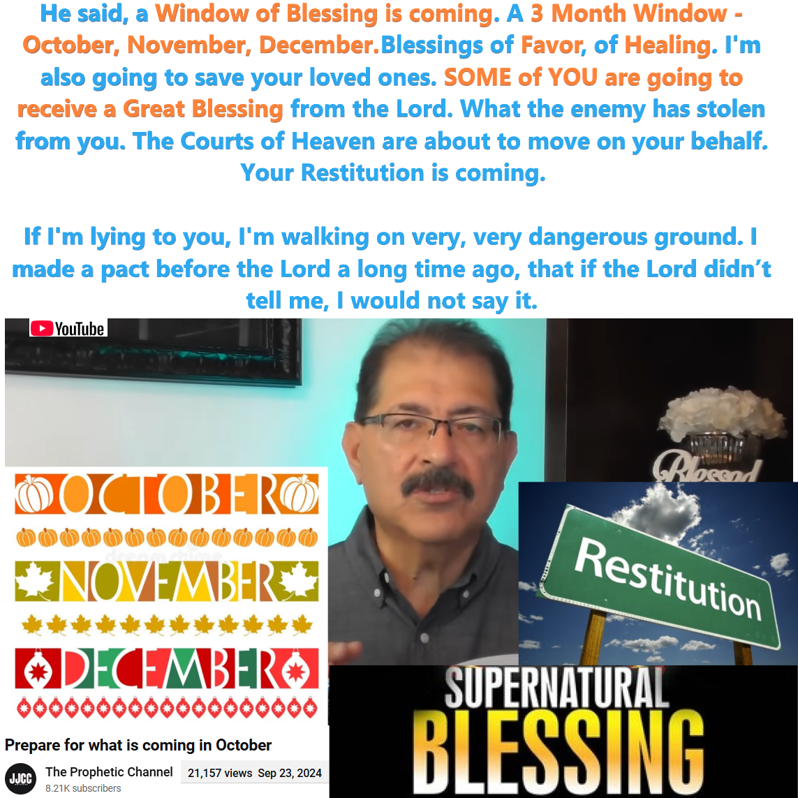 Great Blessing from the Lord in October, November, December! Prophecy by Pastor Gilbert Cervera at The Prophetic Channel (JJCCMinistries). See partial transcript and video link below.