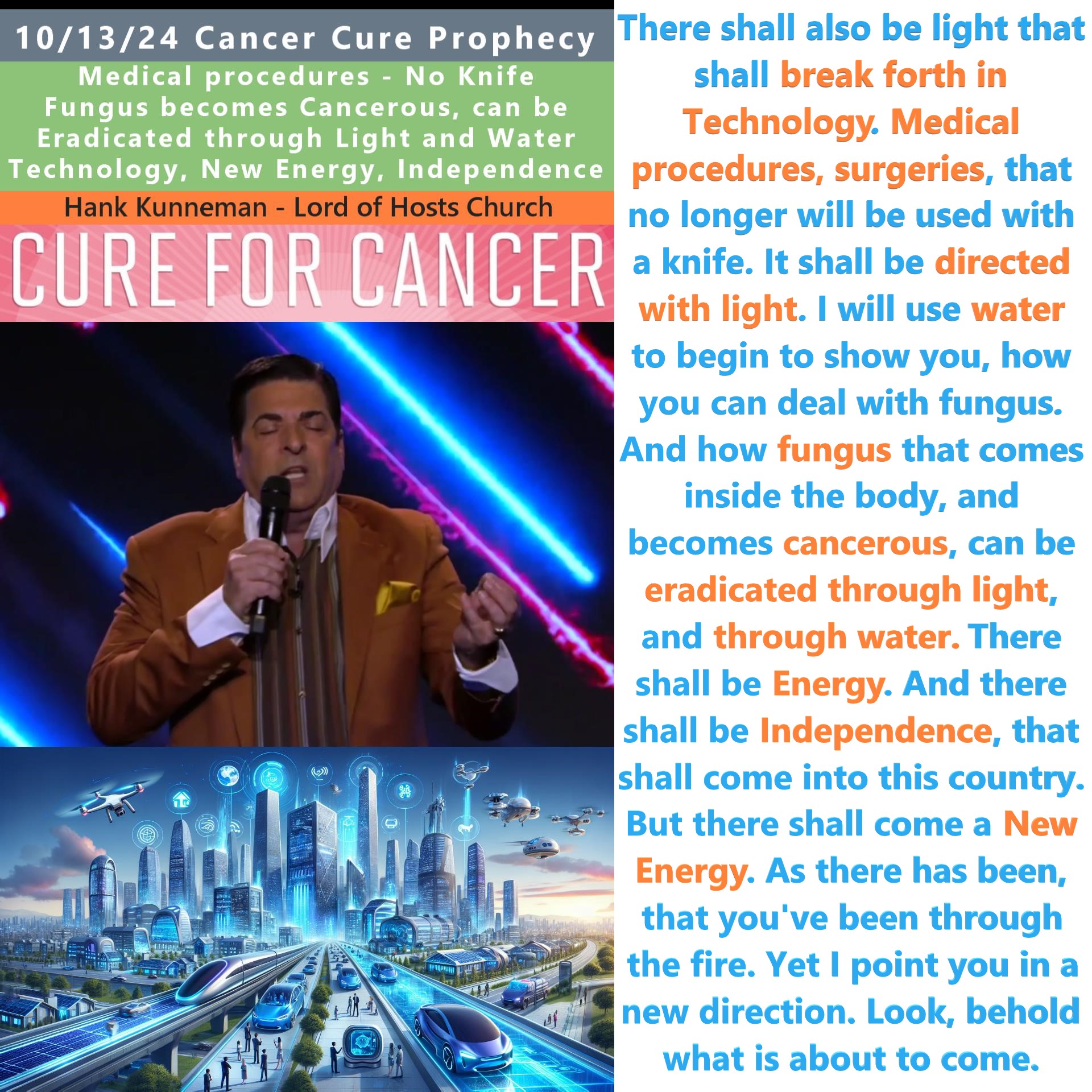 But, there shall also be light that shall break forth in Technology. Medical procedures, surgeries, that no longer will be used with a knife. But it shall be directed with light. God says, watch, watch what begins to break forth with water. How I will use water to begin to show you, how you can deal with fungus. And how fungus that comes inside the body, and becomes cancerous, can be eradicated through light, and through water. And watch what breaks forth in the new era. There shall be Energy. And there shall be Independence, that shall come into this country. But there shall come a New Energy. As there has been, that you’ve been through the fire. Yet I point you in a new direction. Look and behold what is about to come.