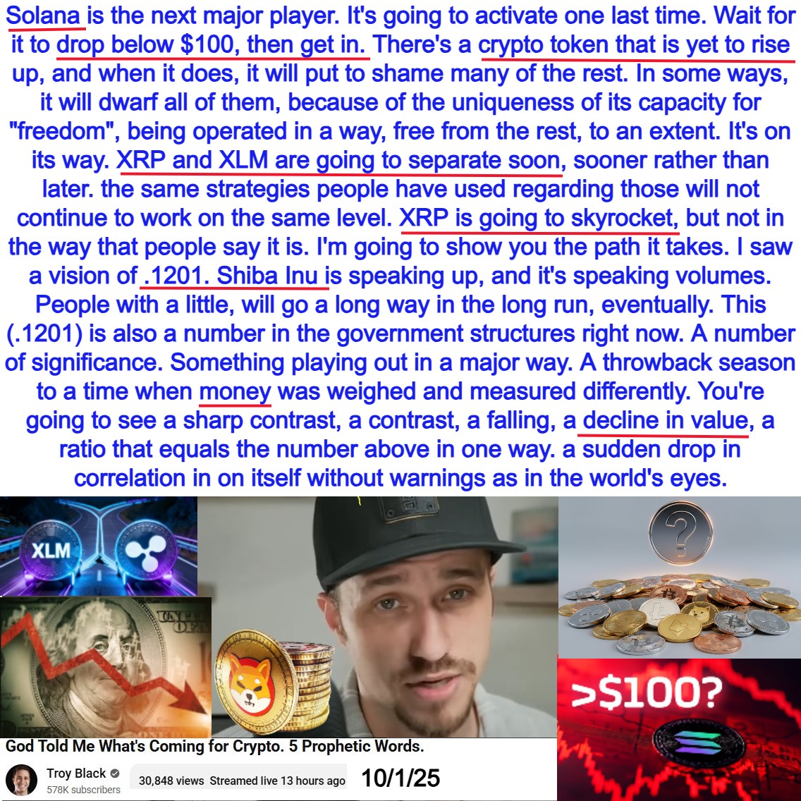 XRP, XLM, Solana, SHIB, Unknown New Coin, Dollar prophecy by Troy Black on 10/1/25. See transcript and video link below: