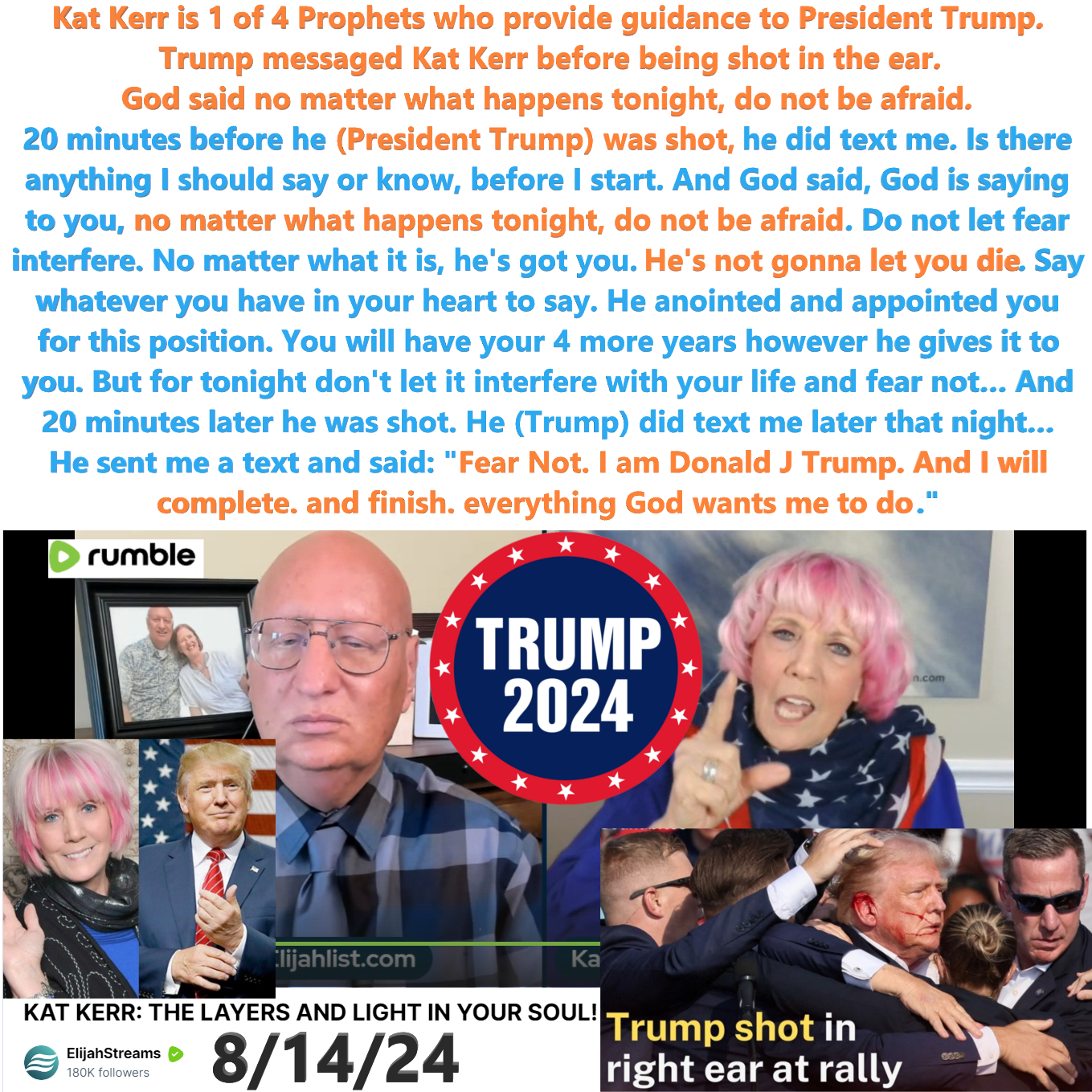 Kat Kerr is 1 of 4 Prophets who provide guidance to President Trump. Trump messaged Kat Kerr before being shot in the ear. God said no matter what happens tonight, do not be afraid. Kat Kerr mentioned this on Elijah Streams. See partial transcript and video link below: