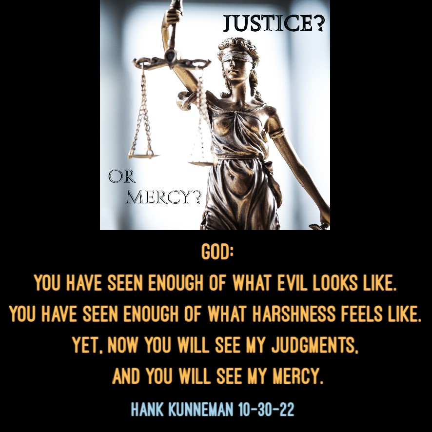 You have seen enough of what evil looks like. You have seen enough of what harshness feels like. Yet, now you will see My Judgments, and you will see My Mercy. (Hank Kunneman 10-30-22)