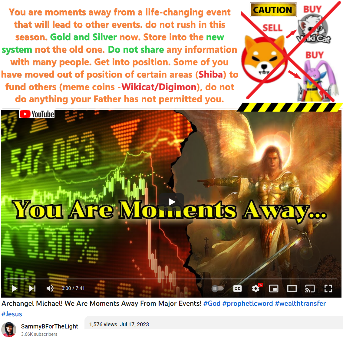 On 7/17/23 SammyBForTheLight (@sammybforthelight1498 ) shared a Prophetic Warning. Some people sold Shiba Inu to buy Meme Coins. They should not have done this, if God did not tell them to do that. See partial transcript and video link below: