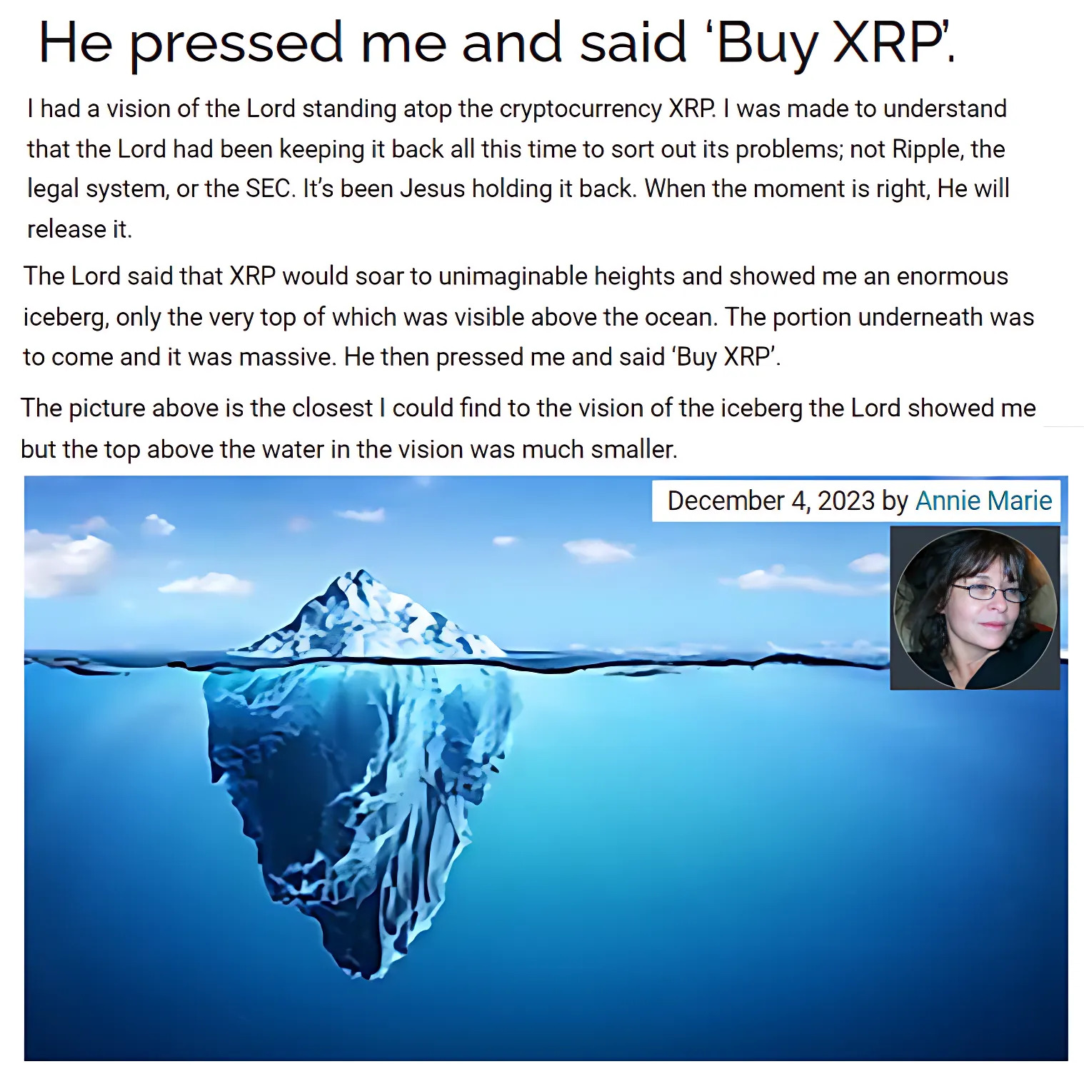 The Lord said that XRP would soar to unimaginable heights and showed me an enormous iceberg, only the very top of which was visible above the ocean. The portion underneath was to come and it was massive. He then pressed me and said ‘Buy XRP’.