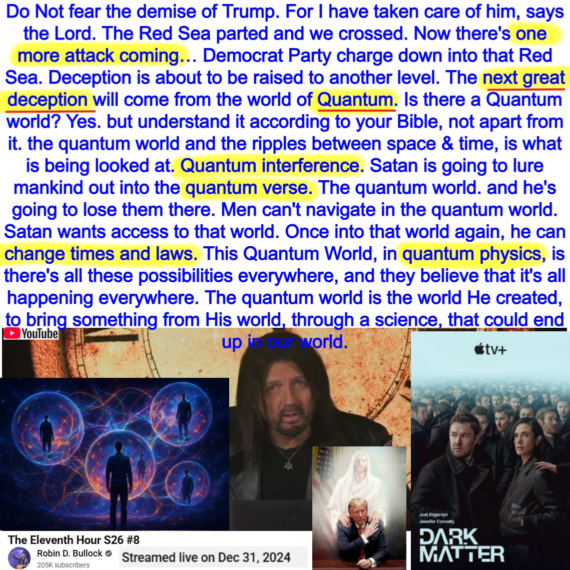Do Not fear the demise of Trump. One more attack is coming – Democrat Party to charge down into the Red Sea. Next great deception will come from the world of Quantum. Prophecy and Teaching from Robin Bullock on 12/31/2024. See my Summary, partial transcript, and video link below: