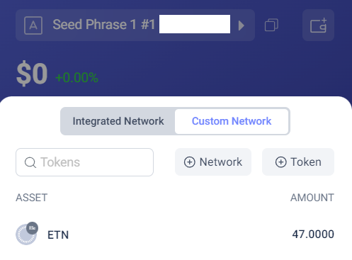7. To send ETN, Click on assets (currently says no assets). Select custom network to see ETN balance. Click on ETN token, Click Send.