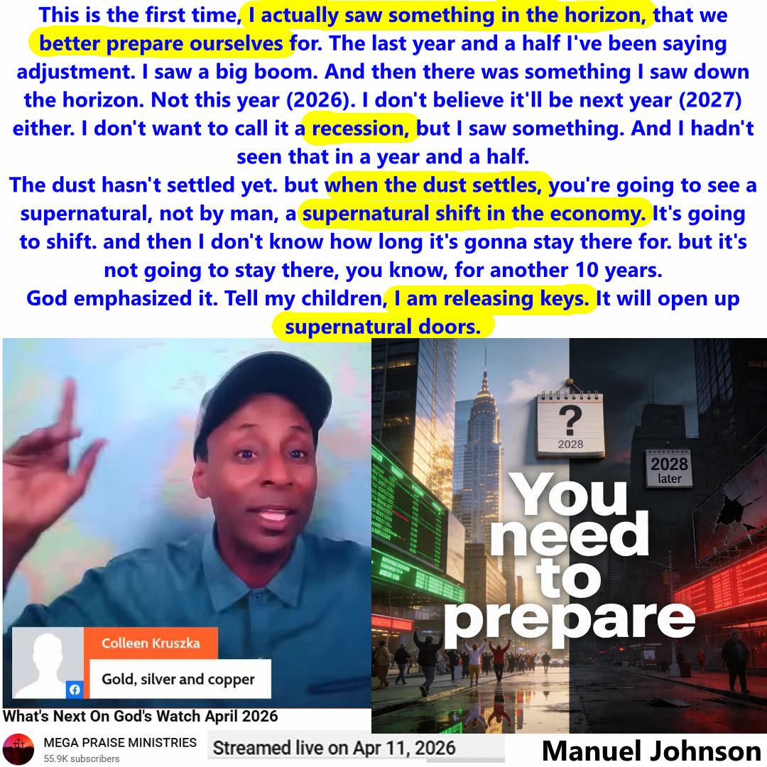 Celebration in April. Supernatural shift in the Economy when dust settles. Something (Recession?) on the horizon (2028?). Prophecy by Manuel Johnson on 4/10/2026. See partial transcript, ai summary, and video link below: