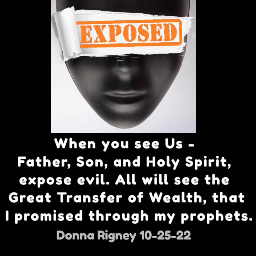 When you see Us – Father, Son, and Holy Spirit, expose evil. All will see the Great Transfer of Wealth, that I promised through my prophets. (Donna Rigney 10-25-22)