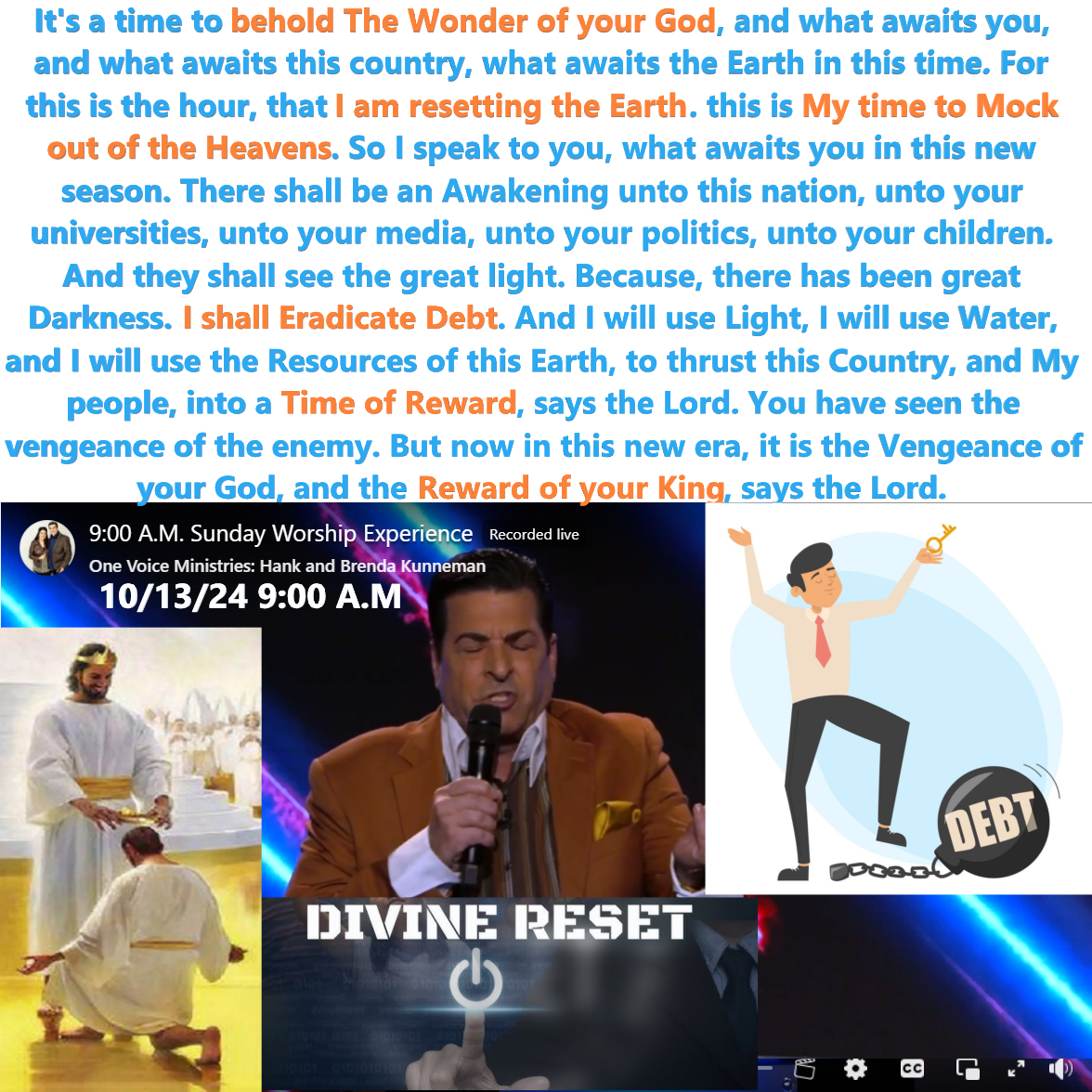 God’s time to Mock out of the Heavens. Reset. Cancelling of Debts. Time of Reward. Cancer Cure. Shifting of Economy. Prophecy by Hank Kunneman on 10/13/24. See partial transcript and video link below: