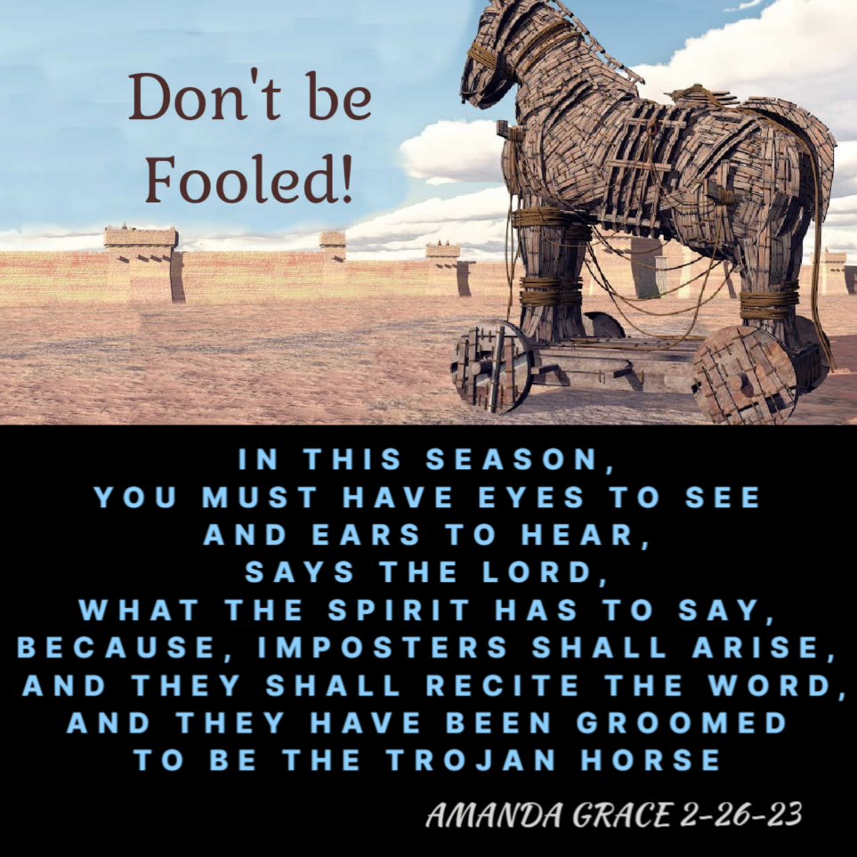 Behold, I the Lord God, am doing a new thing. Do you not see it? In this Season, you must have eyes to see and ears to hear, says the Lord, what the Spirit has to say, because, imposters shall arise — and they shall recite the Word — and they have been groomed to be the Trojan Horse, says the Lord — they have been groomed to come in looking like a gift. It is a curse says the Lord, it is a curse. Pray for discernment My children, in this Season, because, a vessel that may look perfect on the outside, is filled with darkness on the inside. (Amanda Grace 2–26–23)