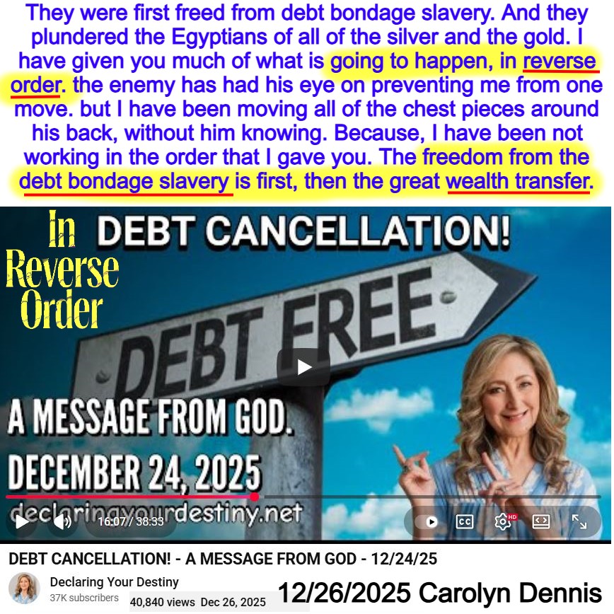 In Reverse Order – Debt Cancellation then Wealth Transfer. Prophecy by Carolyn Dennis on 12/26/2025. See partial transcript, AI Summary, and video link below: