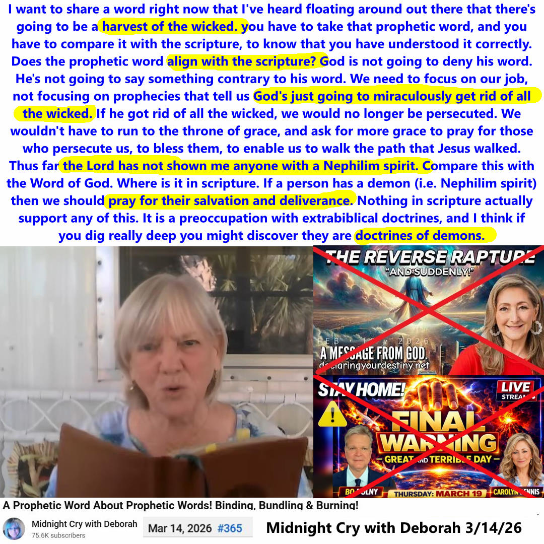 Deborah Williams discusses the Reverse Rapture prophecy and compares it to the Bible. Midnight Cry with Deborah on 3/14/26. See partial transcript, my commentary, ai summary, and video link below: