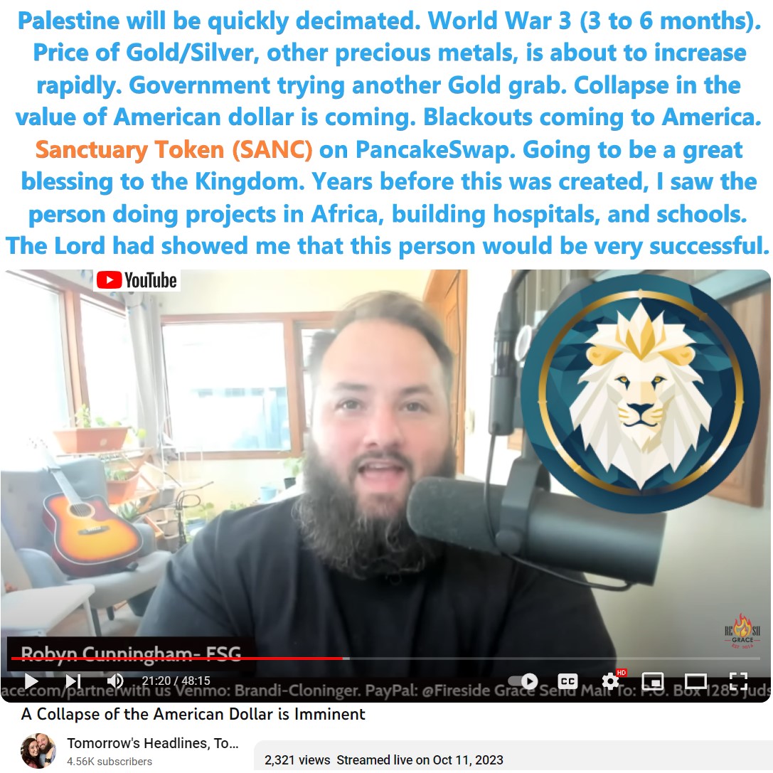 On 10/11/23 Robyn Cunningham shared new prophetic word regarding Sanctuary Token Crypto, dollar collapse, palestine, gold/silver, WW3, and blackouts. See partial transcript and video link below: