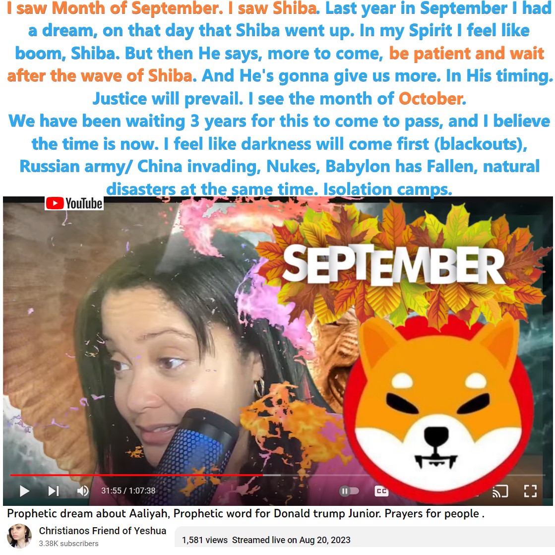 I saw Month of September. I saw Shiba. Last year in September I had a dream, on that day that Shiba went up. In my Spirit I feel like boom, Shiba. But then He says, more to come, be patient and wait after the wave of Shiba. And He’s gonna give us more. In His timing.