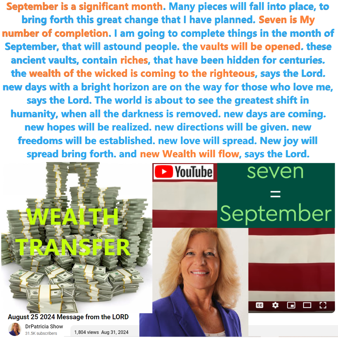 Wealth Transfer in September. September = 7 = Completion. Prophecy by Dr Patricia Show-Green on 8/31/24. See partial transcript and video link below: