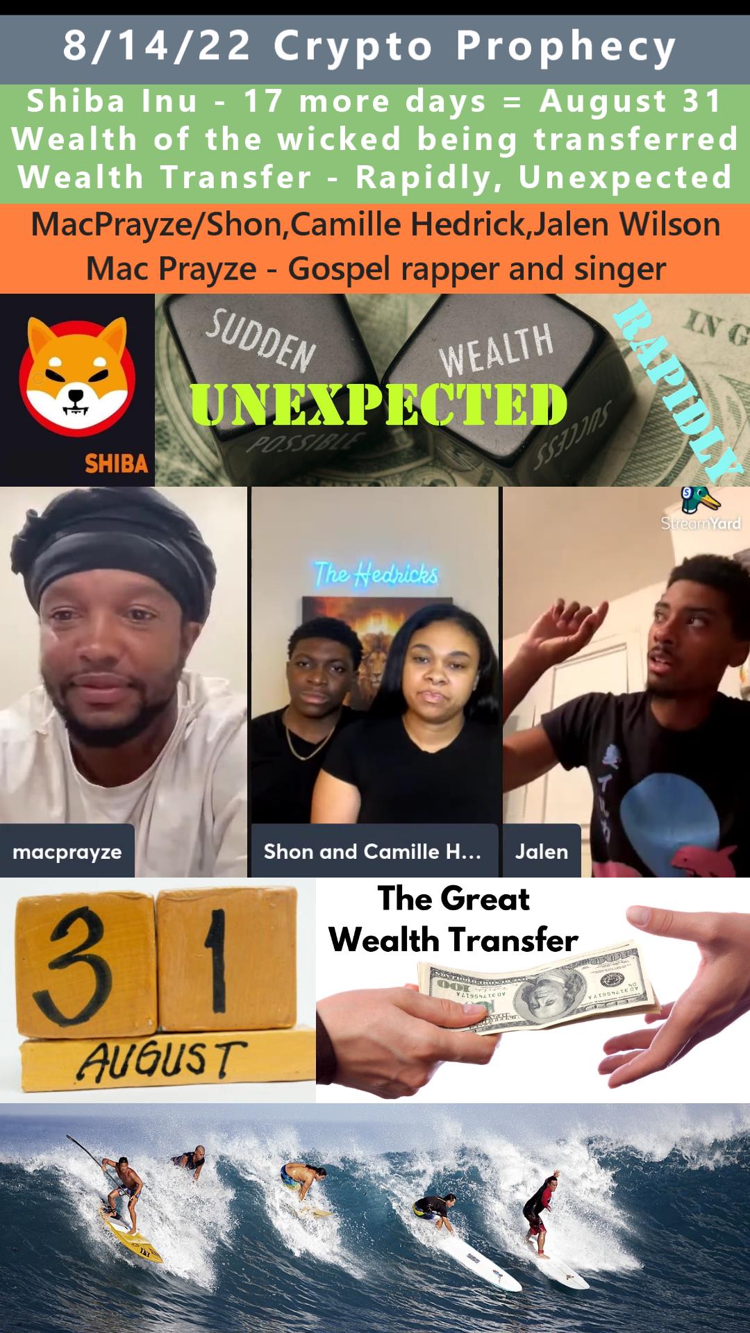 SHIB, 17 more days, Rapidly, Unexpected, Wealth Transfer prophecy Mac Prayze, Shon/Camille H 8/14/2022