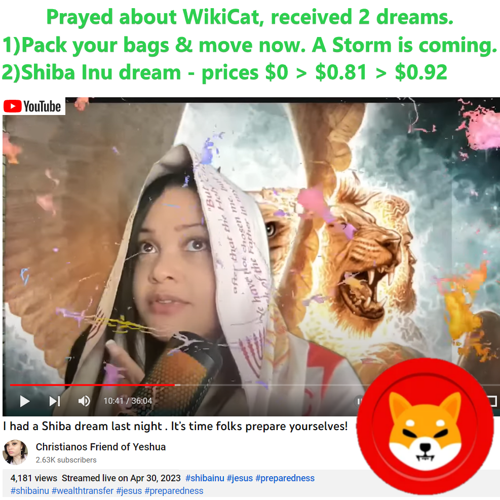 On 4/30/23 Christina (@christianosservantofgod) shared a new prophetic dream about Shiba Inu Crypto. See video link and partial transcript below: