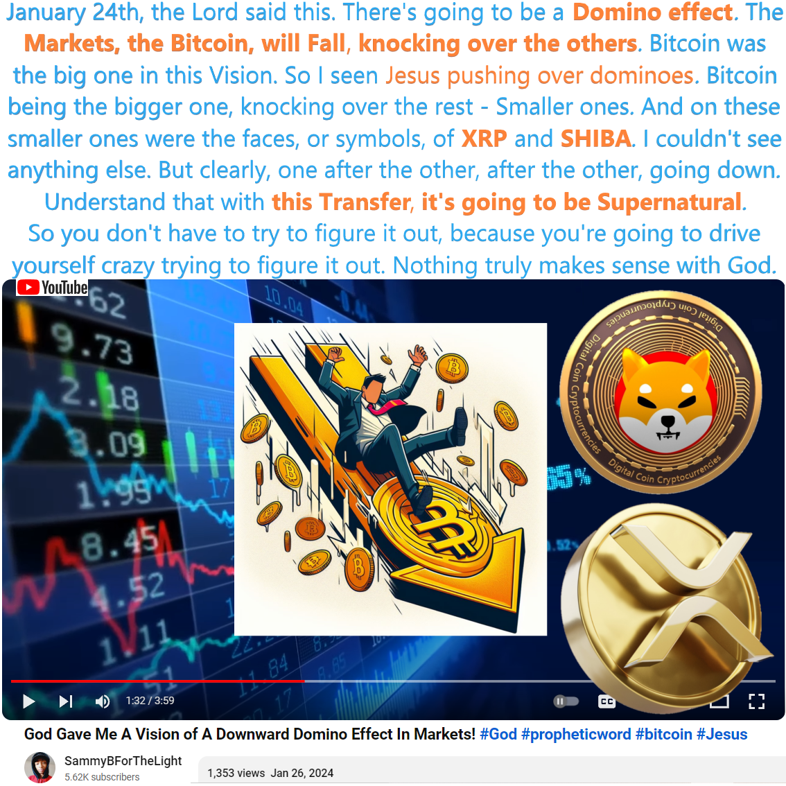0:38 – so January 24th, the Lord said this. there’s going to be a Domino effect. The Markets, the Bitcoin, will fall, knocking over the others. Bitcoin was the big one in this Vision. So I seen Jesus pushing over dominoes. Bitcoin being the bigger one, knocking over the rest – Smaller ones. And on these smaller ones were the faces, or symbols, of XRP and SHIBA. I couldn’t see anything else. But clearly, one after the other, after the other, going down.