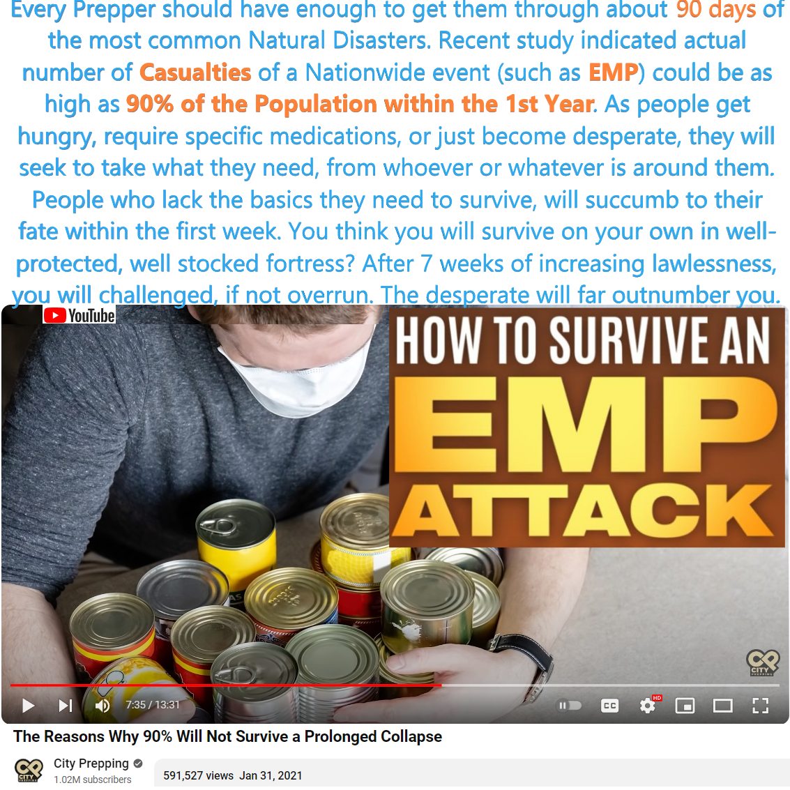 0:51 — even a beginner prepper, should have enough to get them through about 90 days of the most common natural disasters. But in an actual prolonged grid down situation, even the most well prepared, they’re not going to survive. Maybe they will not perish at the same rate as everyone else. Still, even a catastrophic extreme event such as an EMP that may have very low initial mortality numbers, will have exponentially high death tolls, when things truly fall apart. A recent study indicated that the actual numbers of casualties in the aftermath of such a nationwide event, could range between two-thirds of the population, to as high as 90 percent of the people, within the first year.