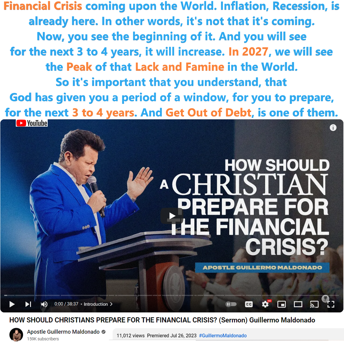 0:12 – I’ve been preaching for the last three years. And prophesying, and predicting, that there’s a Financial Crisis that are coming upon the World. I said upon the World. And I said if you got the numbers, Inflation, Recession, is already here. Luke 6:48-49. In other words, it’s not that it’s coming. Now, you see the beginning of it. And you will see it for the next 3 to 4 years. You will see, will increase. In 2027, we will see the peak of that Lack and Famine in the World. So it’s important that you understand, that God has given you a period of a window, for you to prepare, for the next 3 to 4 years. And Get Out of Debt, is one of them.