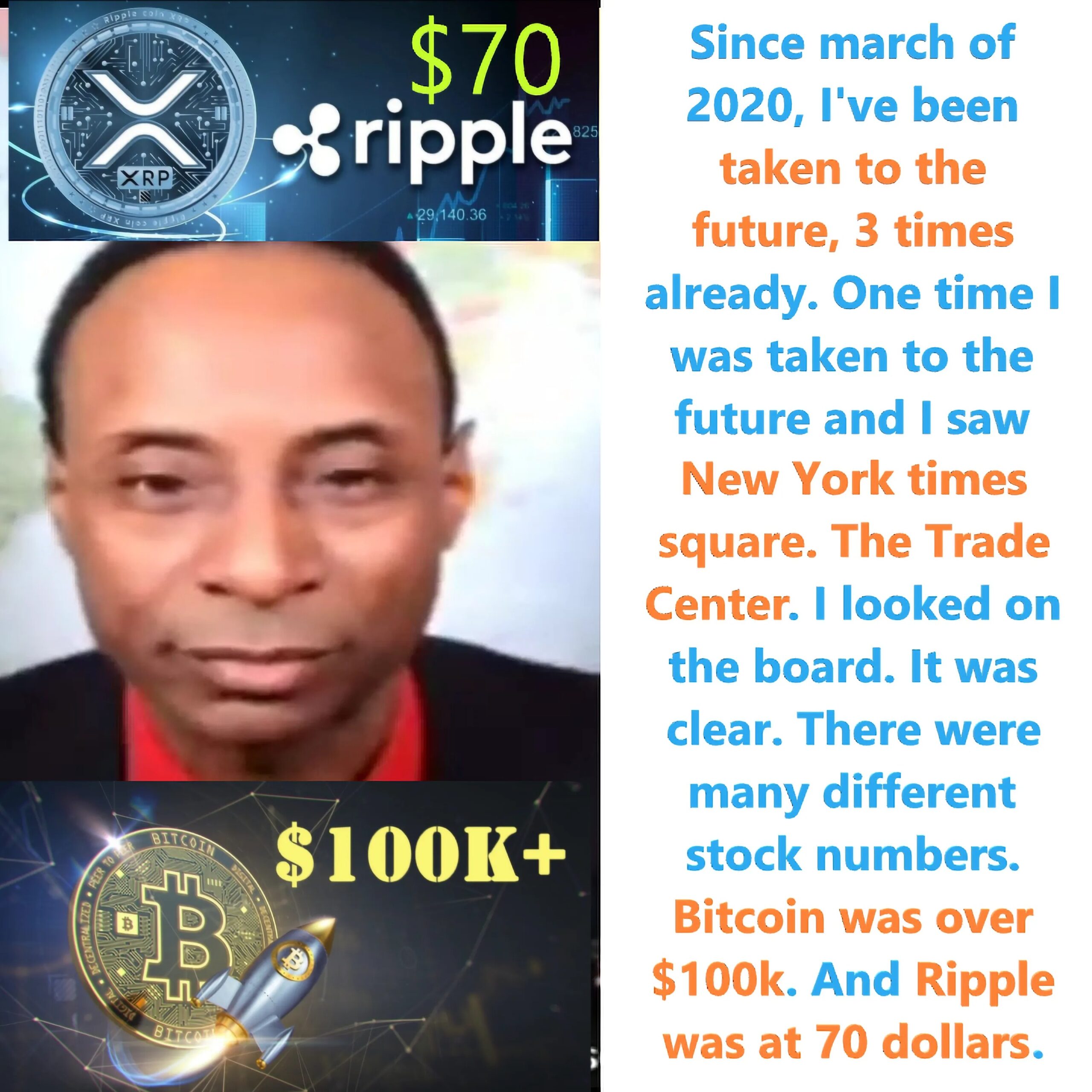 since march of 2020, I’ve been taken to the future, 3 times already. One time, I was taken to the future, and I saw New York times square. I was taken to this place called the Trade Center. I looked on the board. It was clear. God wanted me to see it. And there were many, many different stock numbers. But the one that I noticed was Bitcoin. It was over $100k. And I remember Ripple. I was watching. I saw this thing, called Ripple. And Ripple was at $70 dollars.