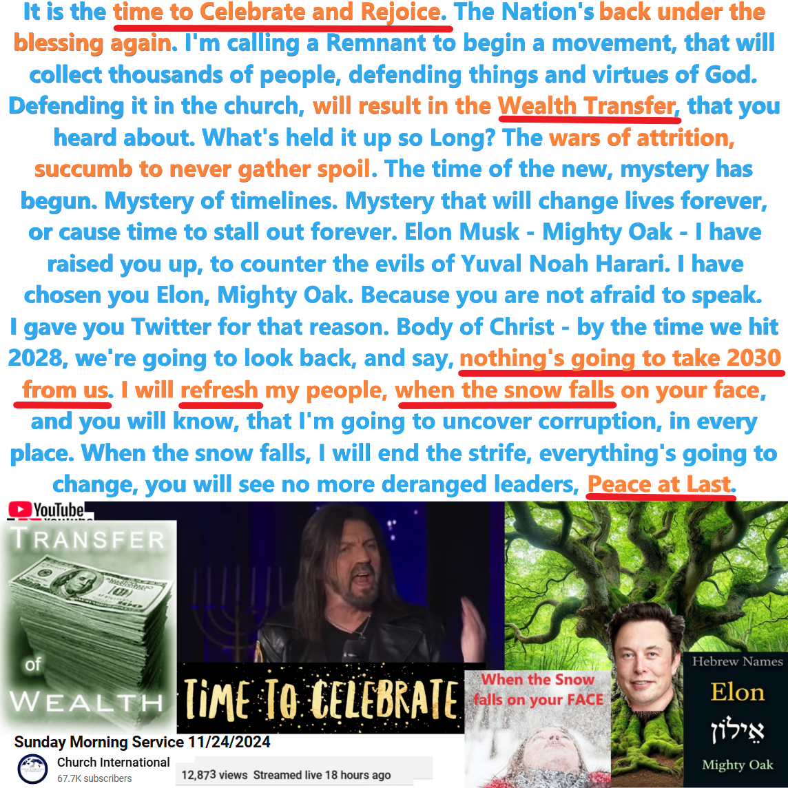 It is the time to Celebrate and Rejoice, says the Lord. The Nation’s back under the blessing again. I hear the Lord say, I’m calling a Remnant in on this side of the page, to begin a movement, that will collect thousands and thousands of people, defending the things of God, defending the virtues of God. And defending it in the church, will result, says the Lord, in the wealth transfer, that you’ve always known about, and heard about. Now you wonder what’s held it up so Long. The wars of attrition, succumb to never gather spoil. The time of the new. the time of mystery has begun. it is a mystery of timelines. a mystery that will change lives forever, or cause time to stall out forever. Elon Musk – Mighty Oak. though you do not know God yet, you are in his hand to use and to do. for I have raised you up, says the Lord, to counter the evils of Yuval Noah Harari. I have chosen you Elon, Mighty Oak. because you are not afraid to speak. I gave you Twitter for that reason. To Eric Trump – I have looked upon you says the Lord, as a Solomon. Body of Christ – by the time we hit 2028, we’re going to look back, and say, nothing’s going to take 2030 from us. I will refresh my people, when the snow falls on your face, and you will know, that I’m going to uncover corruption, in every place. When the snow falls, get ready, says the Lord. I will end the strife, everything’s going to change, you will see no more deranged leaders, Peace at Last.