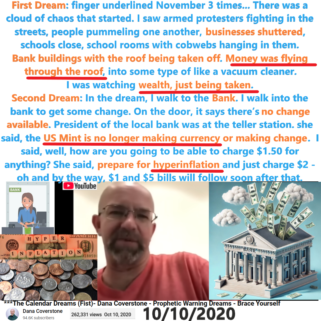 Wealth taken from Banks. Hyperinflation. US Mint no longer making currency or change. Prophetic Dream by Dana Coverstone on June 24, 2010 (posted on 10/10/2020). See partial transcript and video link below: