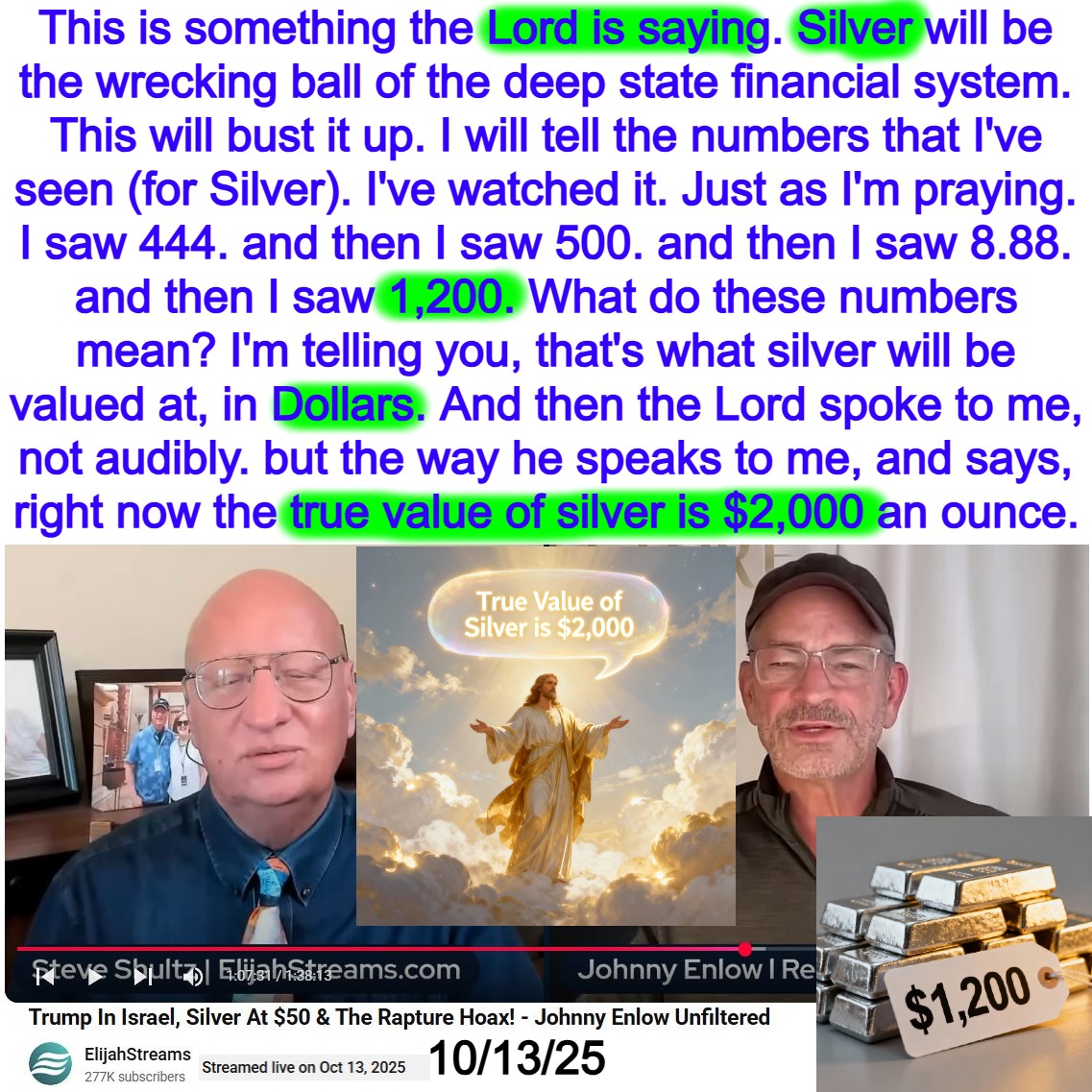 $1,200 Silver and current True Value of $2,000. Prophecy by Johnny Enlow on 10/13/25. See partial AI Summary, partial transcript, and video link below: