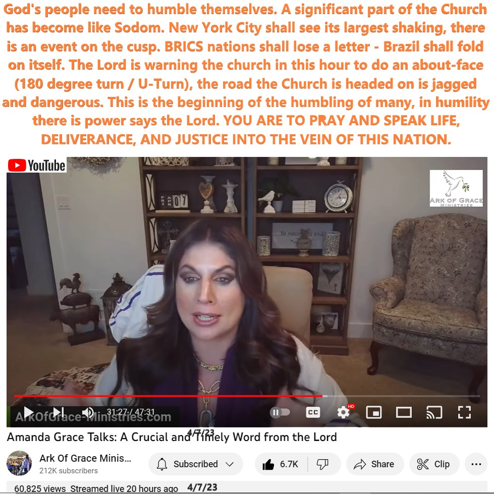 God’s people need to humble themselves. A significant part of the Church has become like Sodom. New York City shall see its largest shaking, there is an event on the cusp. BRICS nations shall lose a letter – Brazil shall fold on itself. The Lord is warning the church in this hour to do an about-face (180 degree turn / U-Turn), the road the Church is headed on is jagged and dangerous. This is the beginning of the humbling of many, in humility there is power says the Lord. YOU ARE TO PRAY AND SPEAK LIFE, DELIVERANCE, AND JUSTICE INTO THE VEIN OF THIS NATION.