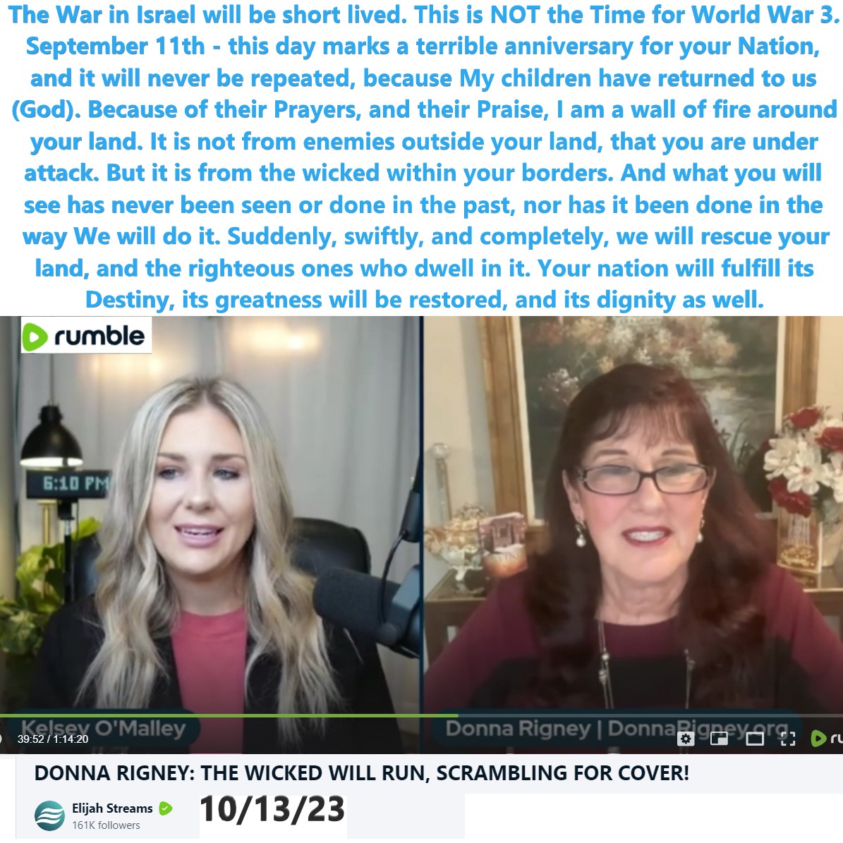 10:50 – This is what He said to me October 10th – The War in Israel will be short lived. There will be much damage on both sides, and much heartbreak. The cost will be high. Israel will react like an Iron Fist slamming down with great force… This will put a sudden stop to the carnage, and it will be My doing. The wicked will run, scrambling for cover, with no avail. Even under the cover of darkness, they will be found and held accountable.