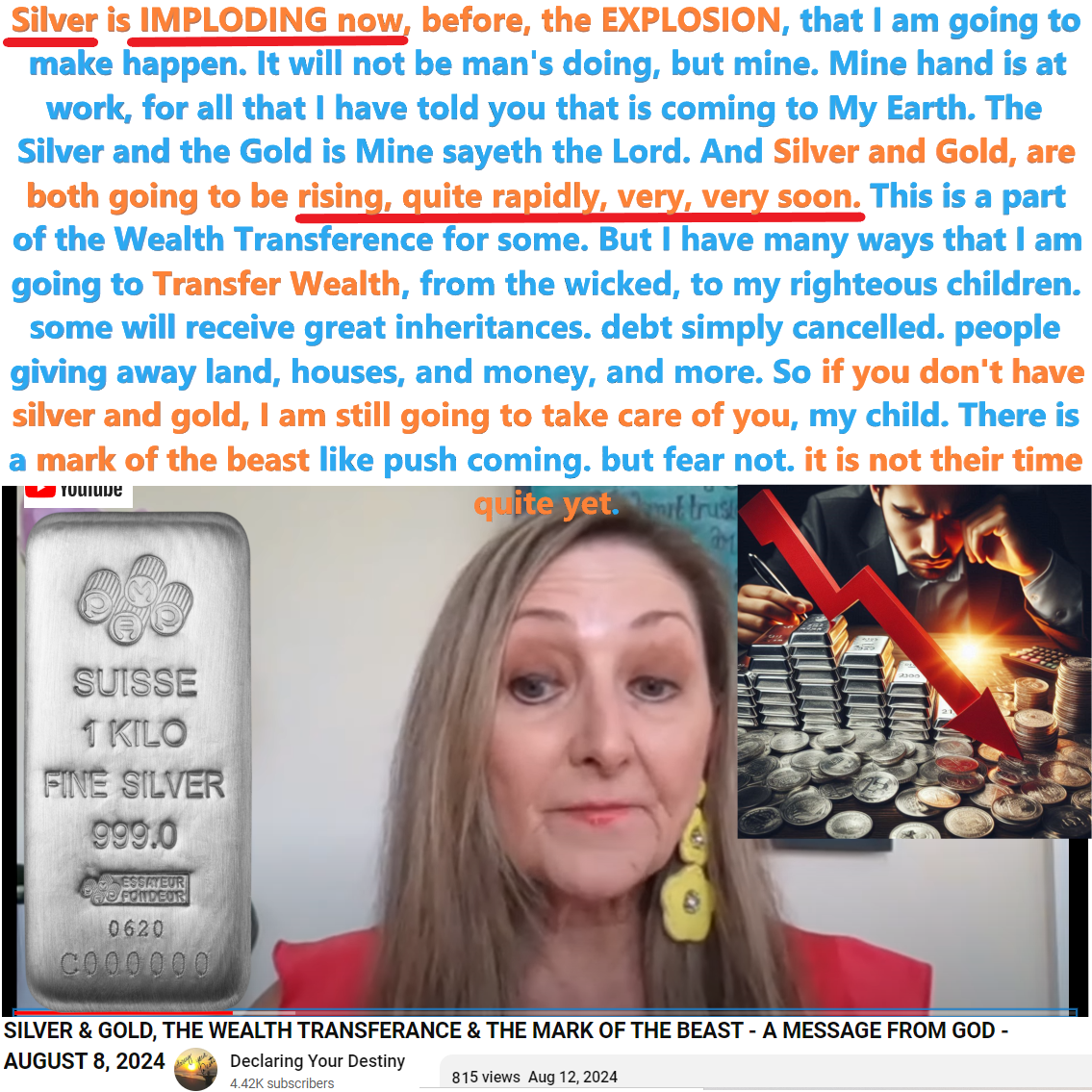 Silver Crash (Implosion) before Rise (Explosion) prophecy by Declaring your Destiny on 8/12/24. See partial transcript and video link below:
