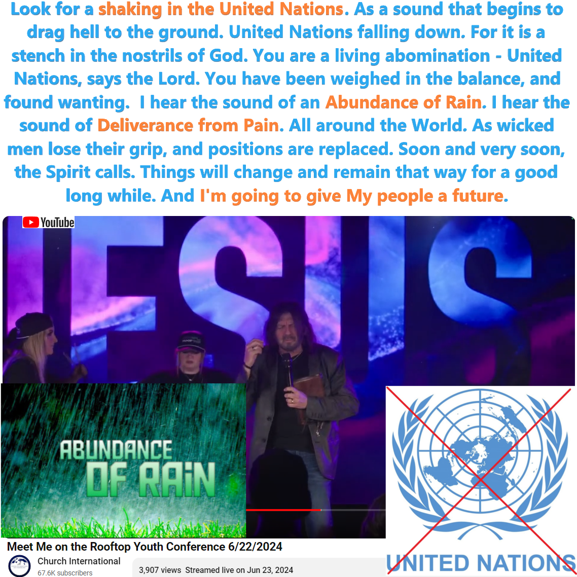 2:12:19 – It’s a sound that’s dragging hell down. Look for a shaking in the United Nations. As a sound that begins to drag hell to the ground. United Nations falling down. For it is a stench in the nostrils of God. and it stinks in my nostrils, says the Lord. You are a living abomination – United Nations, says the Lord. you have been weighed in the balance, and found wanting. for you dare to spit in the face of Israel. Cry and weep, weep and cry. for your future, you will watch it die. I gave you a chance, and you threw it away.