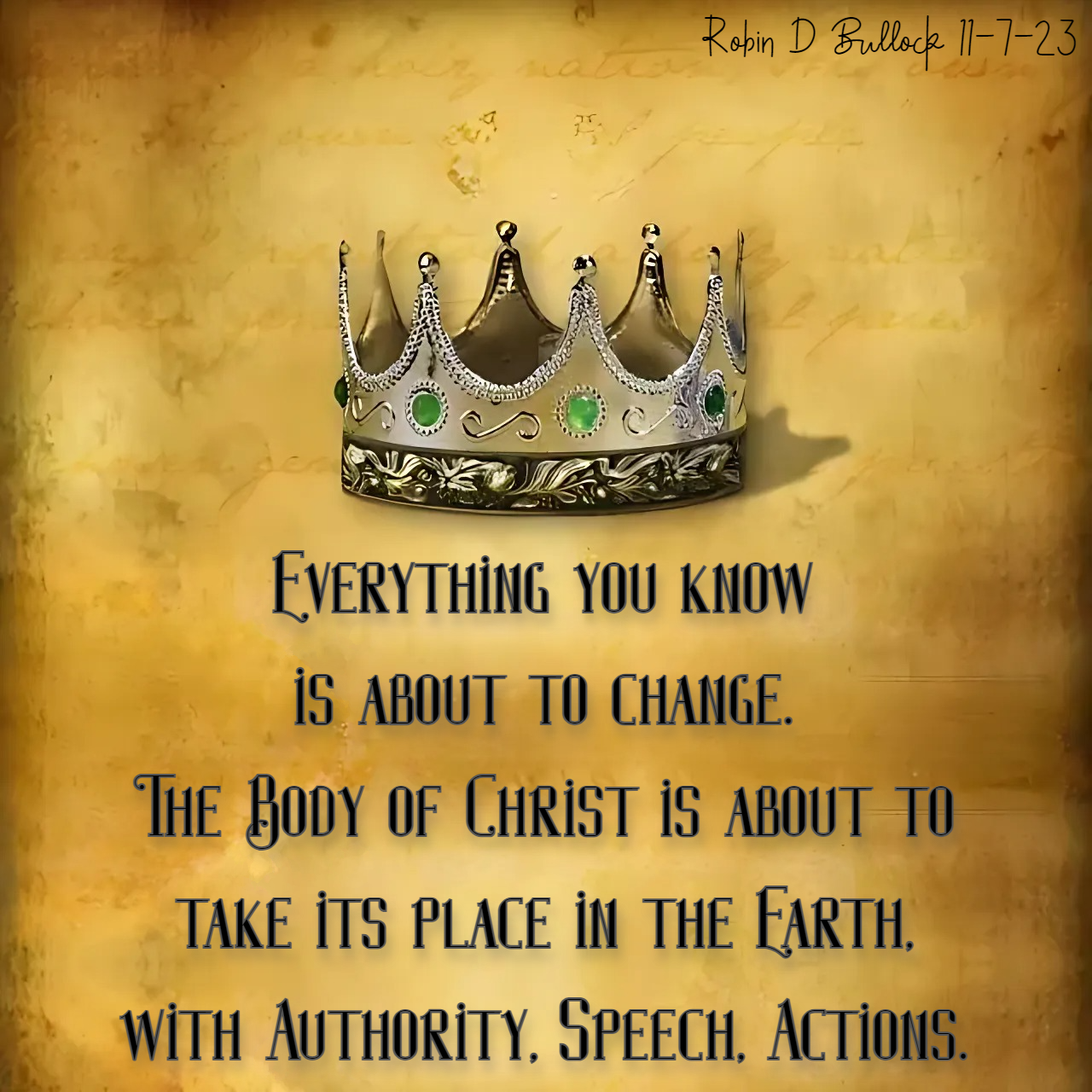 Everything you know is about to change. The Body of Christ is about to take its place in the Earth, with Authority, Speech, Actions. (Robin D Bullock 11-7-23)