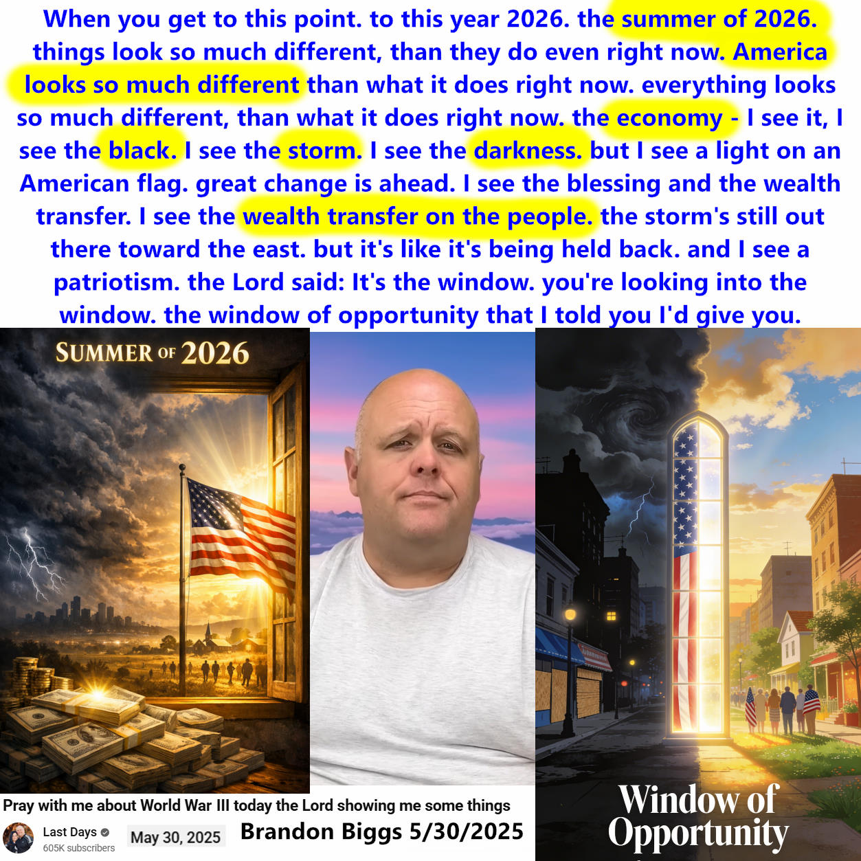 Summer of 2026 – America looks so much different. Economy – I see black, storm, darkness. Light on an American flag, WEALTH TRANSFER on the people. Storm’s still out there toward the east. But it’s like it’s being held back. Prophecy by Brandon Biggs on 5/30/2025. See partial transcript, ai summary, and video link below: