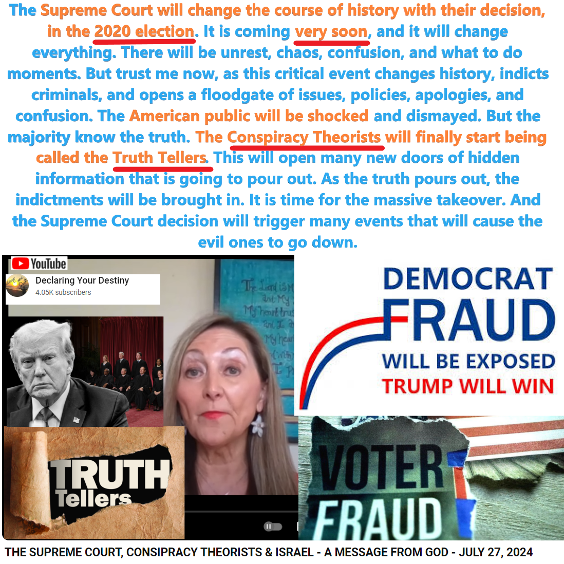 4:10 – This is a message from God, from July 27, 2024. This is from God. The Supreme Court will change the course of history with their decision, in the 2020 election. It is coming very soon, and it will change everything. There will be unrest, chaos, confusion, and what to do moments. But trust me now, as this critical event changes history, indicts criminals, and opens a floodgate of issues, policies, apologies, and confusion. The American public will be shocked and dismayed. But the majority know the truth. The Conspiracy Theorists will finally start being called the Truth Tellers.