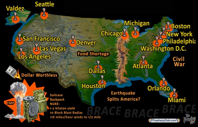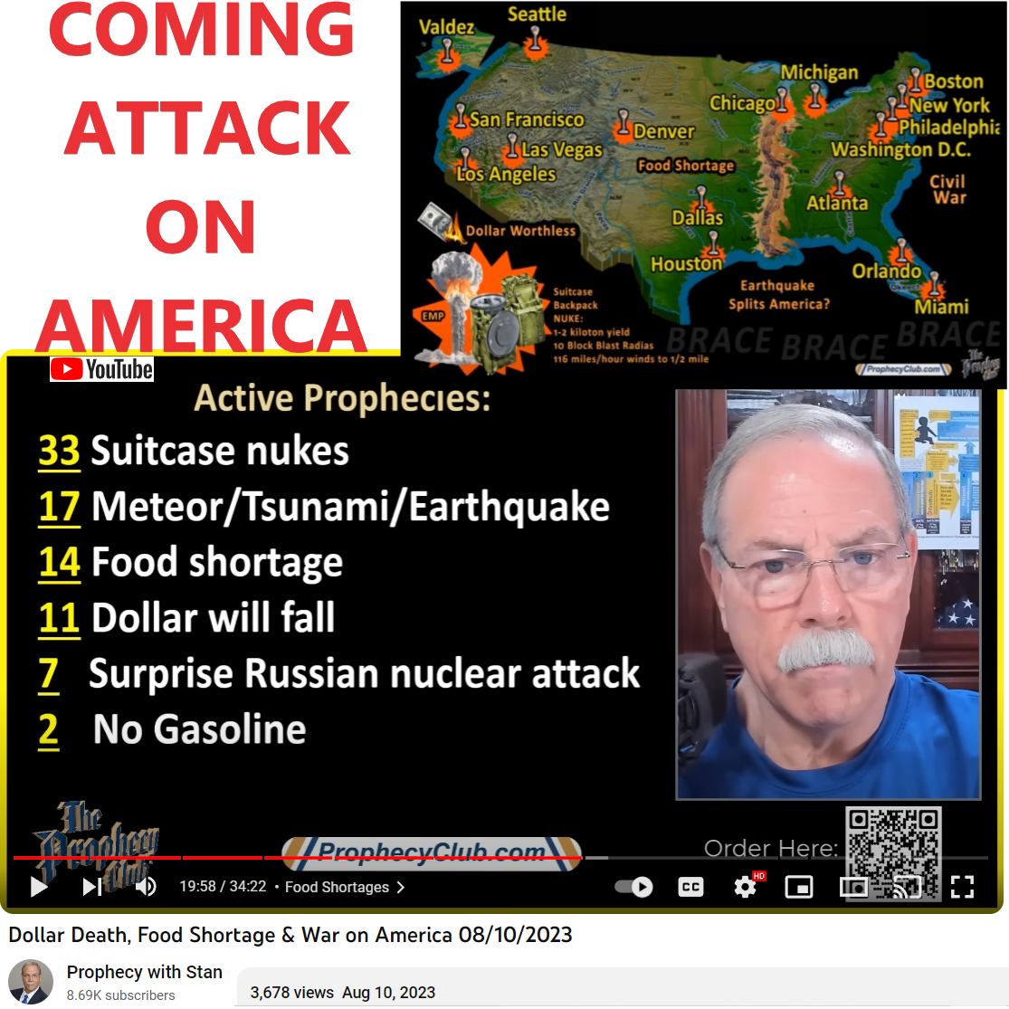 Prophecy Club (Prophecy with Stan) is a channel that tracks Prophecies related to the coming attack on America. It is very likely that we may see this or at least some part of this happen this or next year. Please keep in mind no dates are given for these prophecies. For all we know, many of them could happen 100 years from now. Hence, no need to panic yet. See links below: