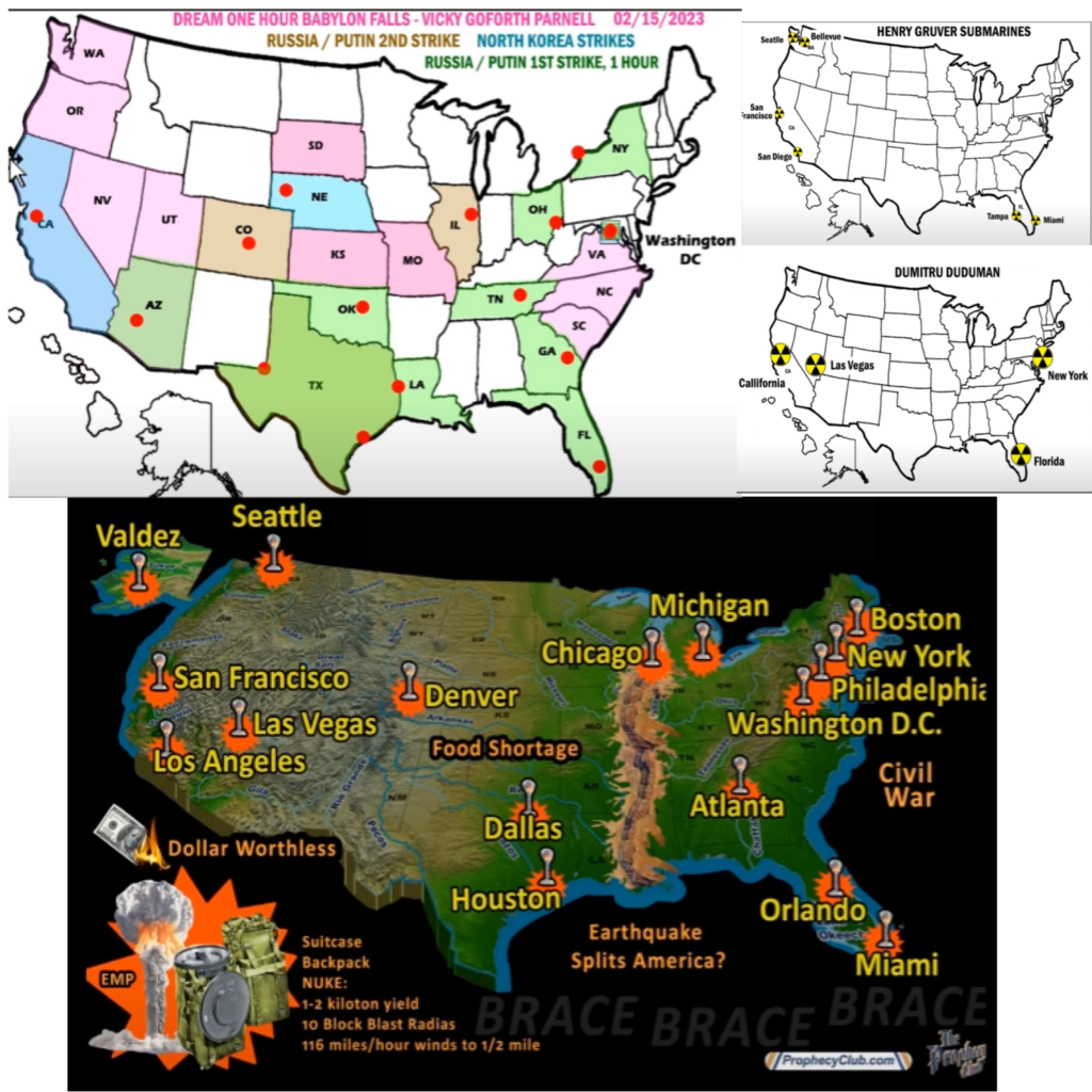 The sources detail specific maps and visions from several prophets regarding nuclear strikes by Russia and North Korea. These strikes are described not as “suitcase nukes,” but as massive weapons 250 to 500 times more powerful than the bombs dropped on Hiroshima or Nagasaki,.
