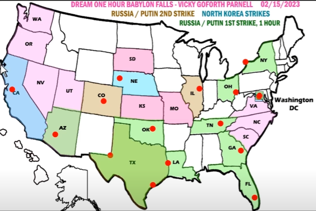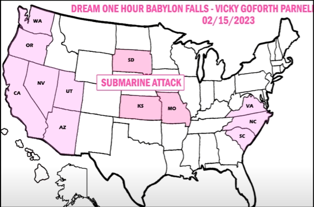 • Dream One Hour Babylon Falls - Vicky Goforth Parnell 2/15/23 Submarine Attack - Washington, Oregon, California, Nevada, Utah, Arizona, South Dakota, Kansas, Missouri, Virginia, North Carolina, South Carolina