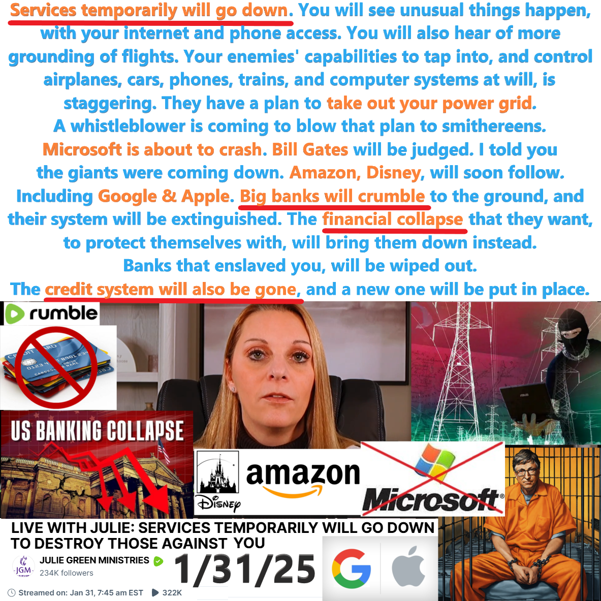 Banks wiped out, Credit System gone, Microsoft crash, Giants (Amazon, Disney, Google, Apple) coming down. Prophecy by Julie Green on 1/31/25. See partial transcript and video link below: