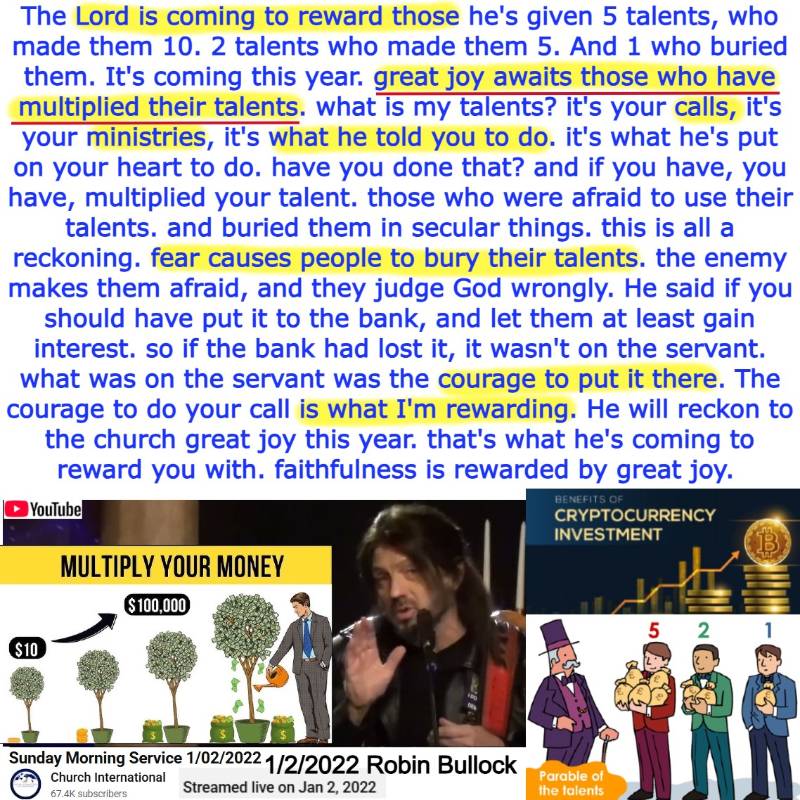 The Lord is coming to reward those who’ve multiplied their talents. Prophecy and Teaching by Robin D Bullock on 1/2/22. See partial transcript and video link below: