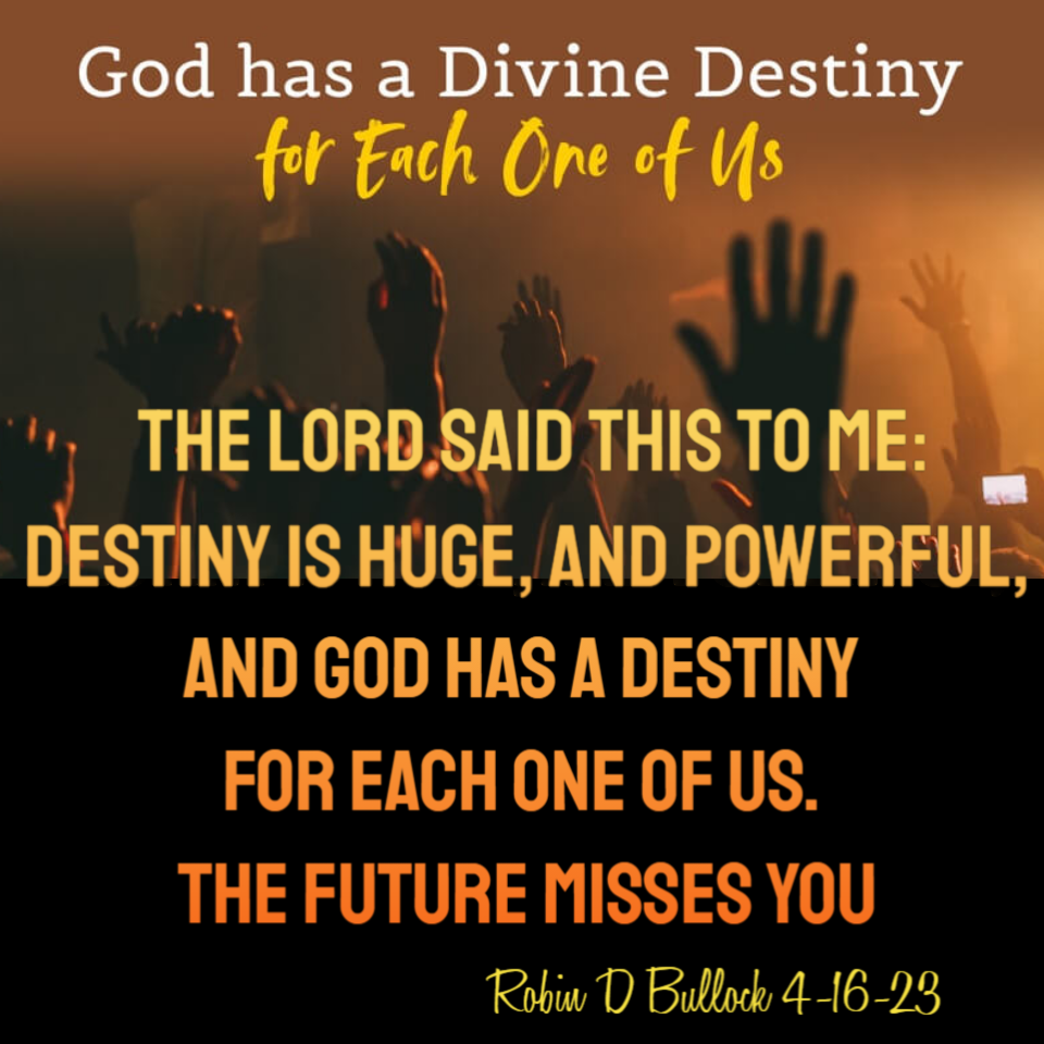 The Lord said this to me in the middle of the night: Destiny is Huge, and Powerful, and God has a Destiny for each one of us. The Lord had me write this down, He said: the Future misses you. (Robin D Bullock 4–16–23)