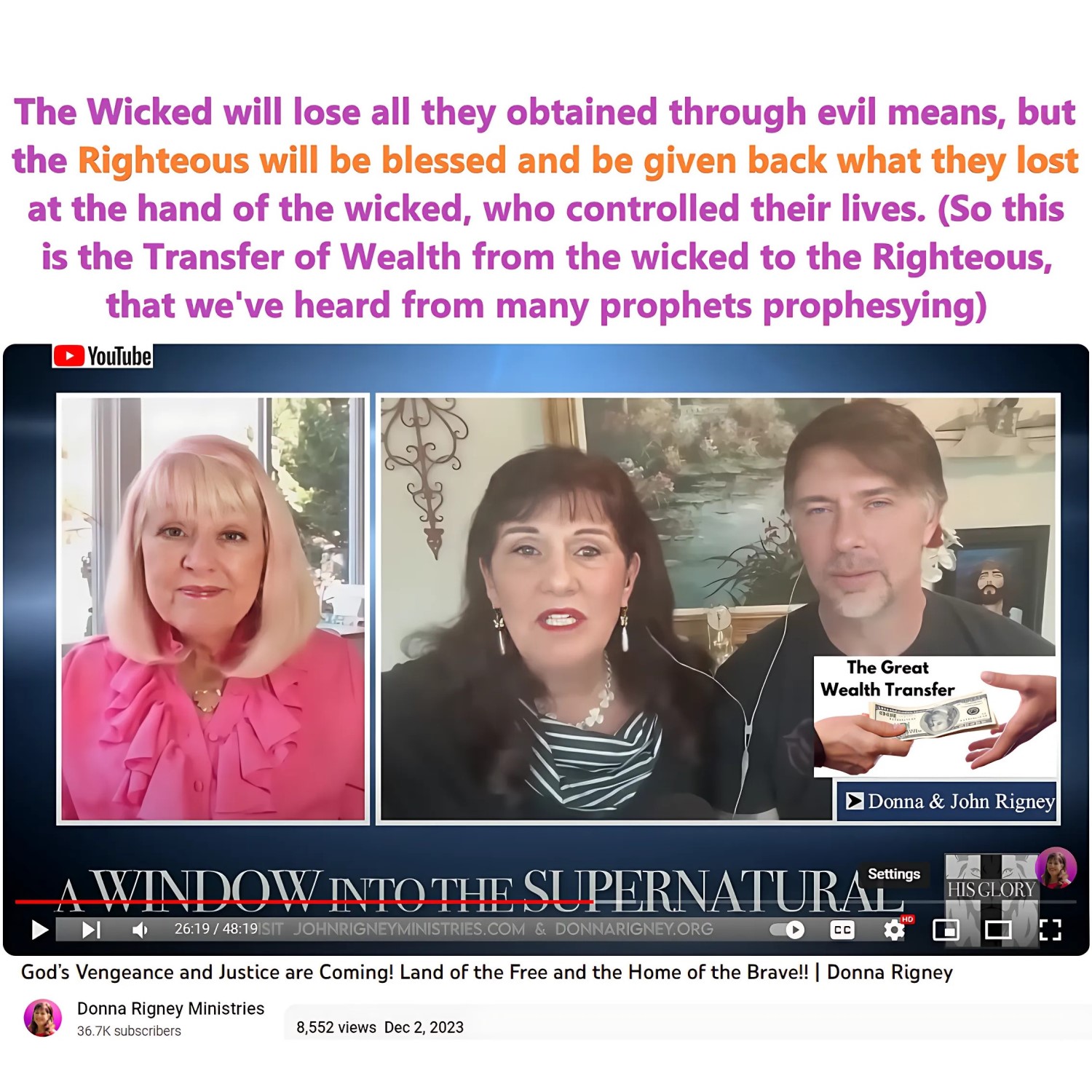 12/2/23 Prophetic Word regarding the coming Wealth Transfer by Donna Rigney. See partial transcript and video link below: