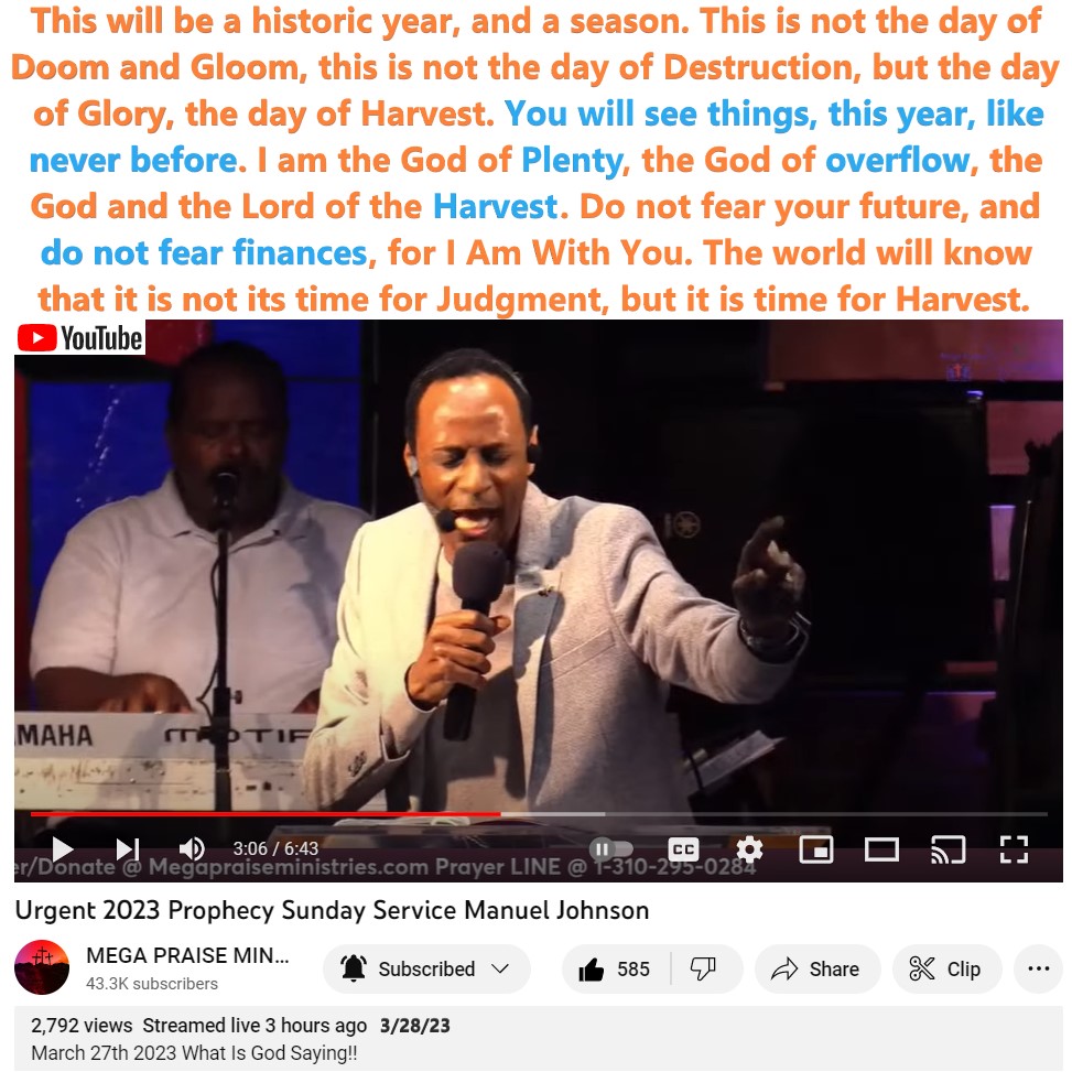 On 3/28/23 Manuel Johnson (@manueljohnsonministries7056 ) shared a new Prophetic word. Please see my summary, video link, and partial transcript below.