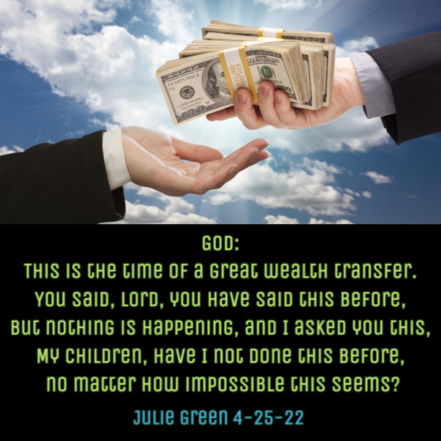 God: This is the time of a great wealth transfer. You said, Lord, you have said this before, but nothing is happening, and I asked you this, My children, have I not done this before, no matter how impossible this seems? (Julie Green 4-25-22)