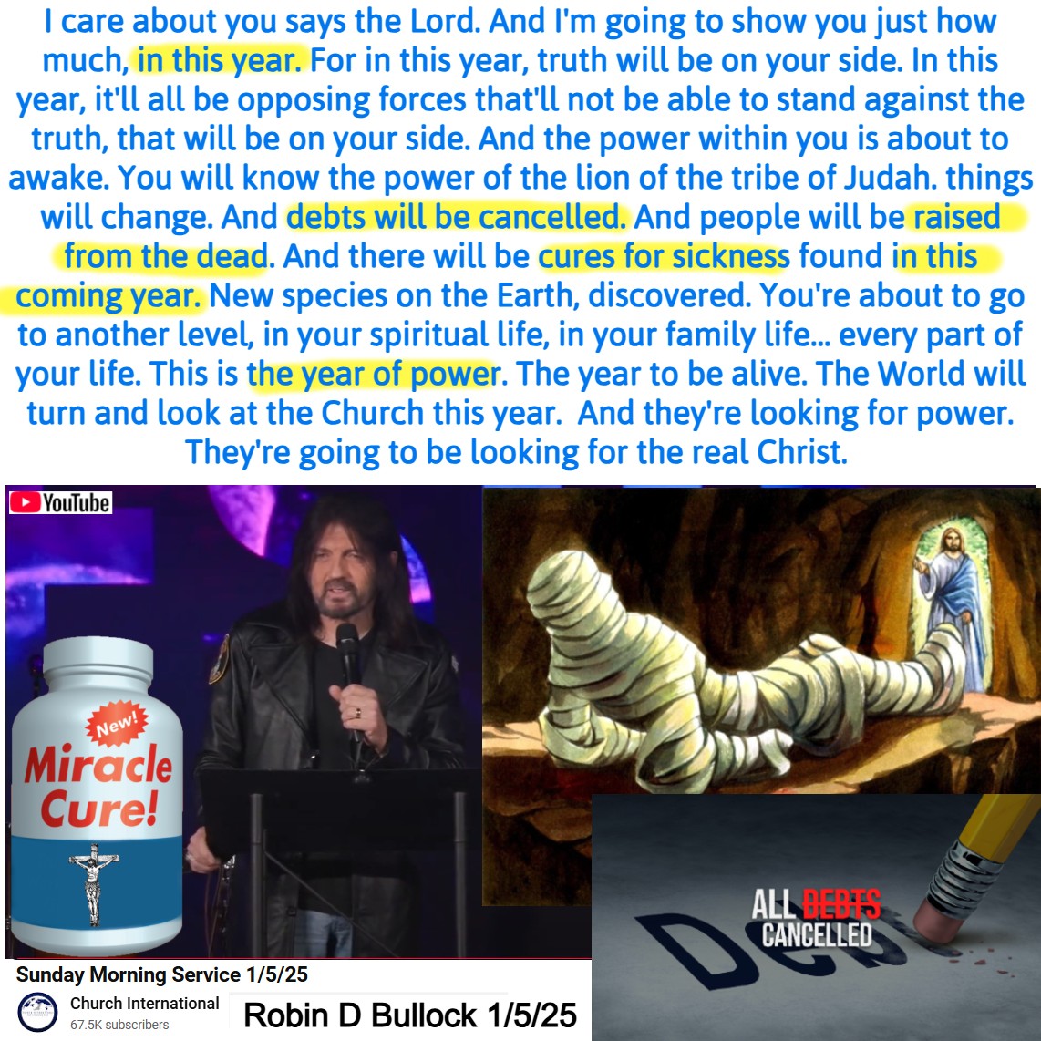 Debts will be cancelled, people will be raised from the dead. Cures for sickness will be found in this coming year. Prophecy by Robin D Bullock on 1/5/25. See partial transcript and video link below: