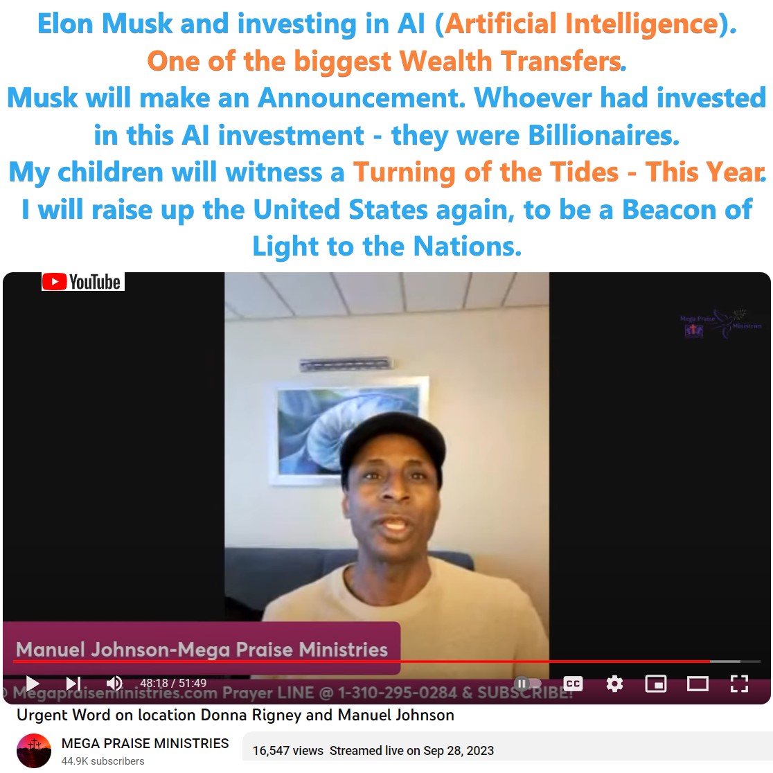 On 9/28/23 Manuel Johnson shared a prophetic message about the Wealth Transfer and AI (Artificial Intelligence). See partial transcript and video link below: