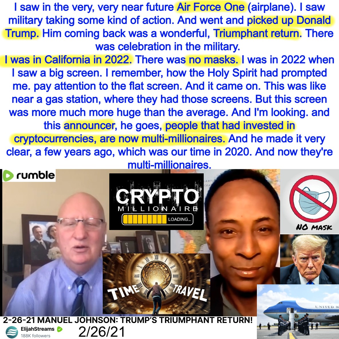 Air Force One picked up Trump. Time Travel – No masks in 2022. People that had invested in cryptocurrencies, are now multi-millionaires. Prophecy by Manuel Johnson on 2/26/21. See partial transcript and video link below: