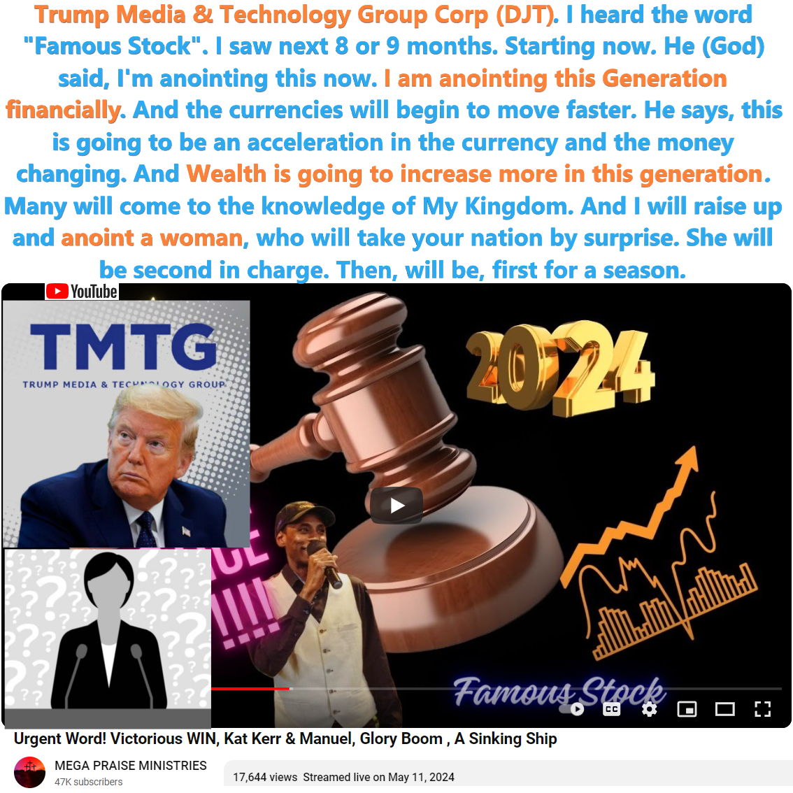 23:18 – so I’m in this vision and the Lord is ministering to me the vision and then the conf another confirmation someone in person connected with me and said something about this… I want to release it on live stream, so you can see what I saw. The vision was the word DJT. And this came with a personal confirmation. It was Trump Media Technology Group. This is coming in the visions and in the natural. I heard the word “Famous Stock”. That was the word the Lord was giving me.
